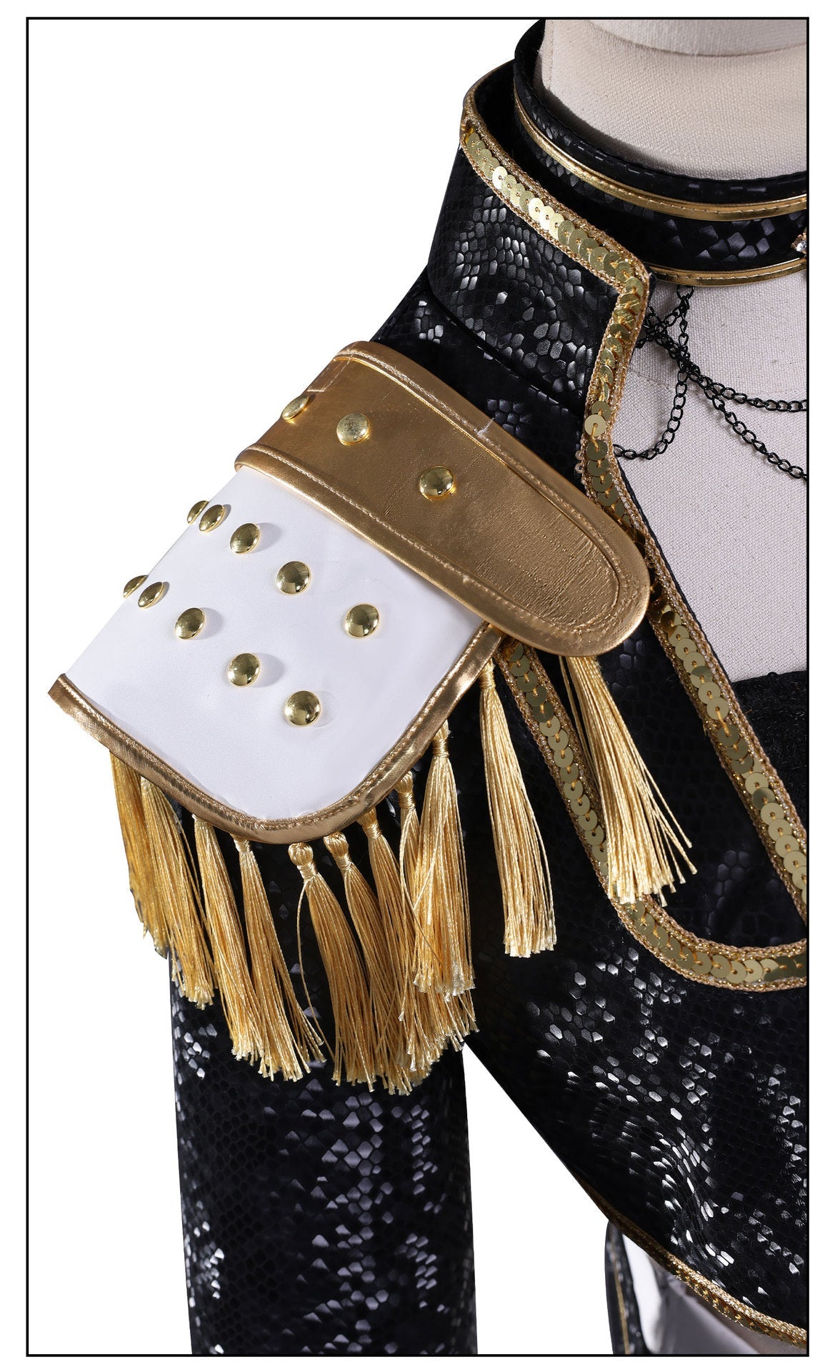 Fabric: White leather / Gold leather / Yellow satin / Black lining / Sequins / White leather on both sides / Gold leather on both sides / Gold binding / Elastic lining / Black leather