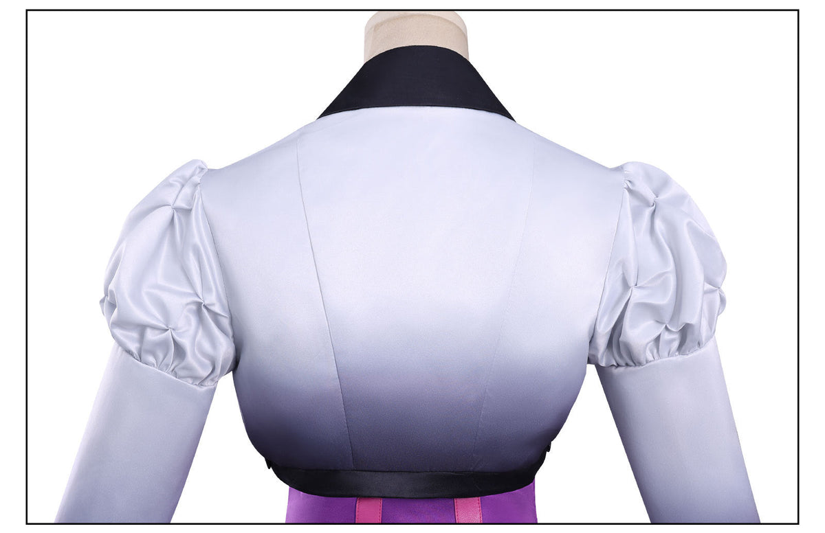 Fabric: White four-way stretch / Stretch black leather / Black hard leather laser-cut / Purple wedding satin / Wedding satin print / Purple lining / 40g lining / Silver leather embroidery / White soft tweed